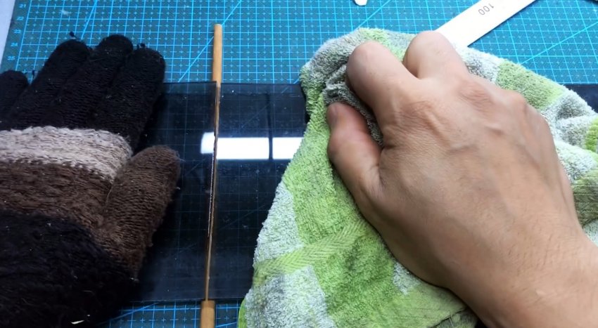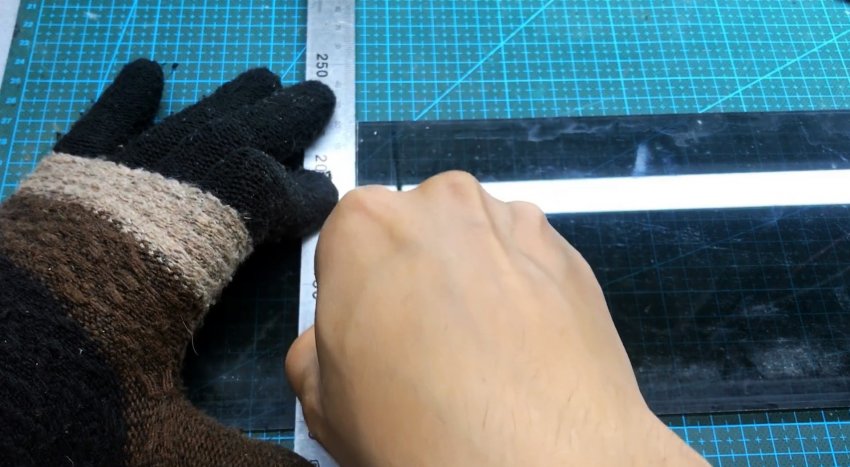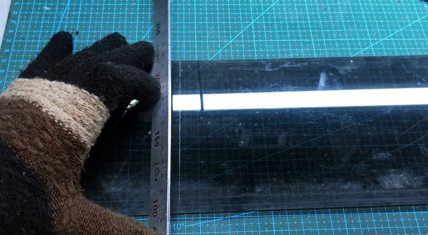 Полученным осколком, зажатым в пальцах, наносится царапина на стекло под линейку. Вести нужно от края до края в направлении на себя.