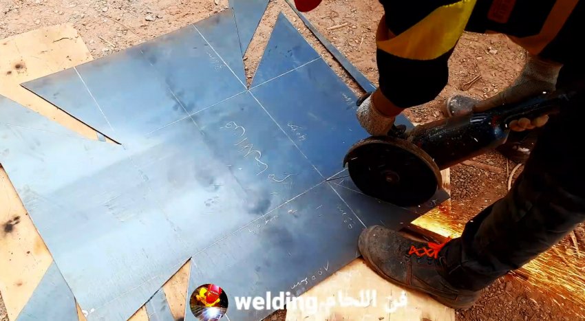 По линиям, проведенным под углом на двух противоположных кромках, отрезаем болгаркой полу-клинья.