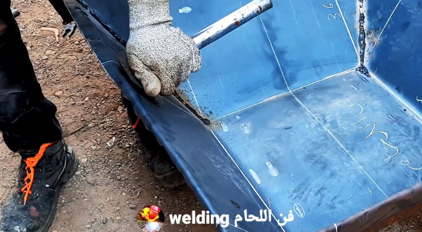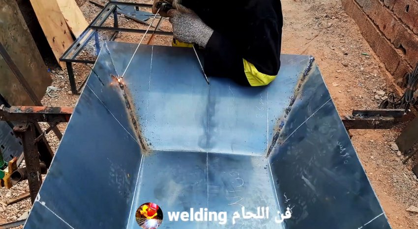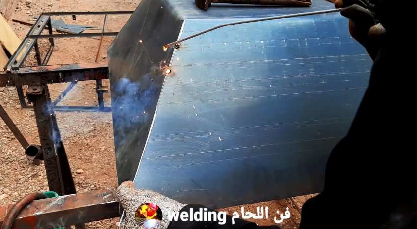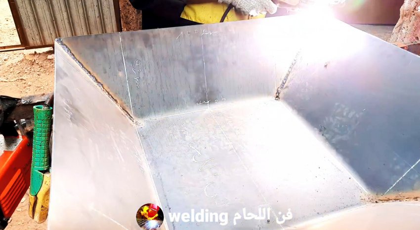 Переворачиваем кузов дном вниз и накладываем изнутри по всем сторонам сплошные сварные швы от дна до верхней кромки для придачи нужной прочности кузову.