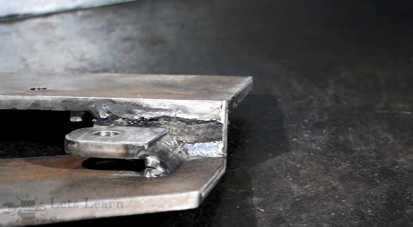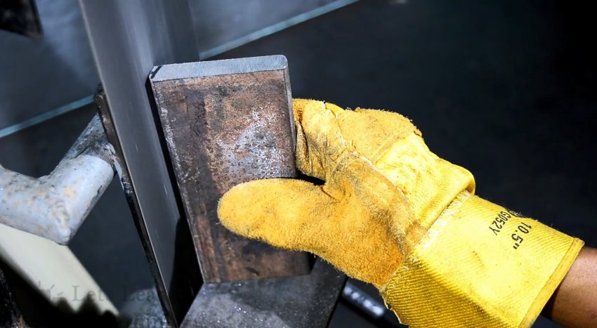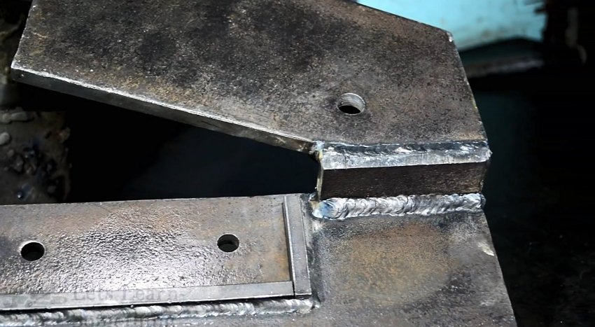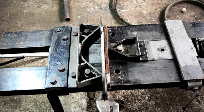 На следующем этапе требуется сделать упоры для ножей, наварив на рычаги рамки из квадрата. Далее большие заготовки рамы ножей свариваются между собой через пластину. Для устойчивости снизу привариваются поперечины из уголка.