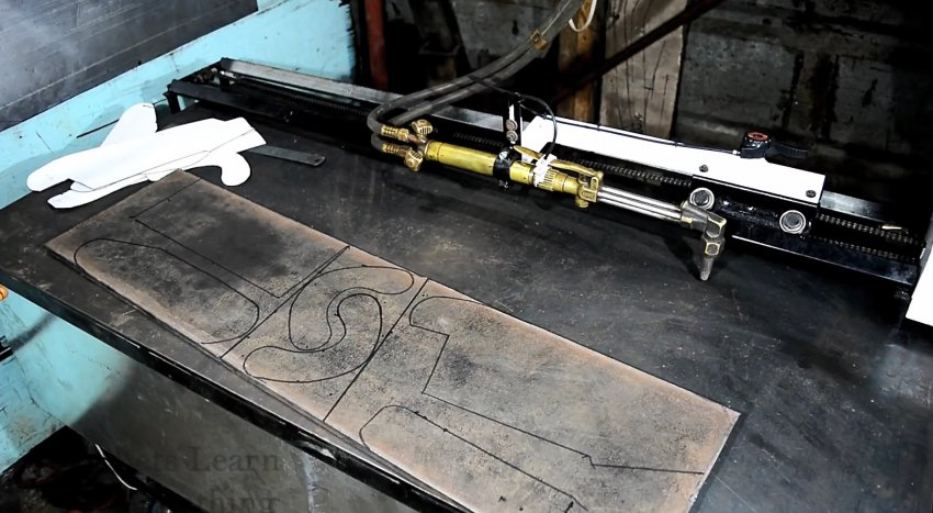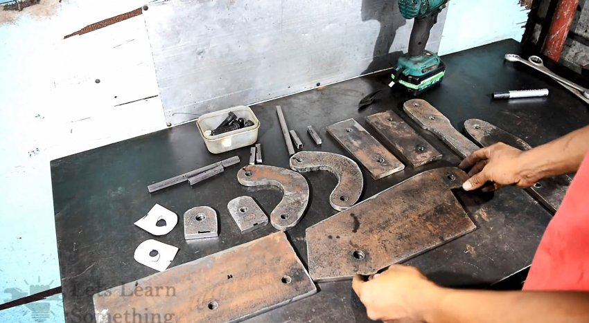 Из листовой стали толщиной не менее 10 мм нужно вырезать силовые детали ножниц. Заготовки станины, рычаги и дуги для этого лучше сначала нарисовать на картоне, и сделать шаблоны, чтобы готовые детали были точно подогнаны друг к другу.