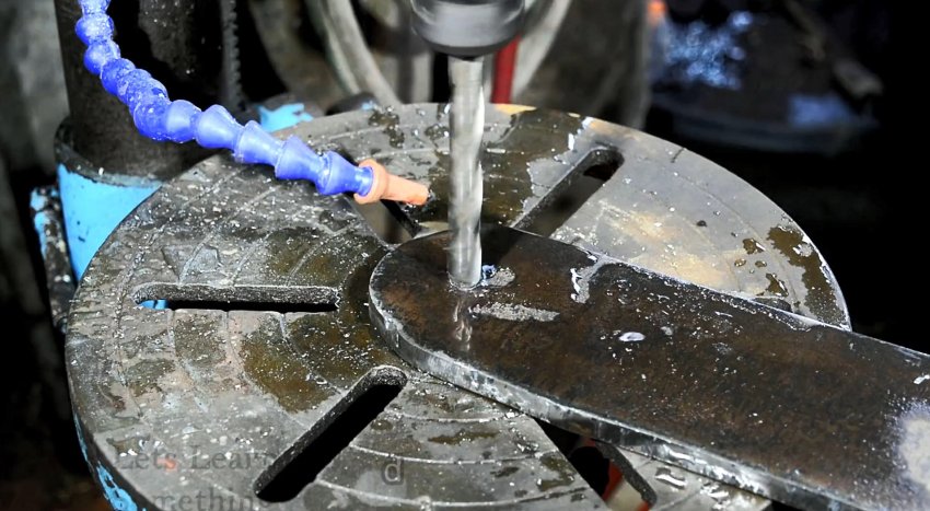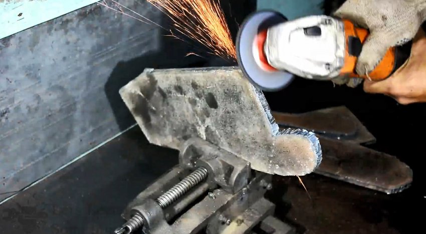 К рычагам прикручиваются заготовки ножей. Для этого они предварительно просверливаются. Для их удержания достаточно по 2 болта. Здесь важно понять принцип крепления, вырезать для этого проушины и потом правильно их приварить.