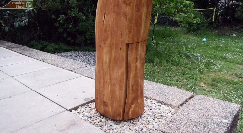 При возникновении желания построить террасу с использованием столбов из кривого кругляка, возникает проблема с их установкой. Неправильная геометрия таких опор смотрится очень интересно и выгодно на фоне участка загородного дома, но создает затруднение при монтаже. Предлагаемый способ позволяет установить столбы на 100% надежно, ровно, а кроме этого еще и предотвращает их гниение.