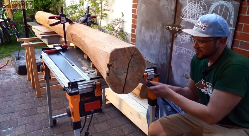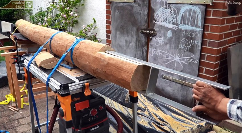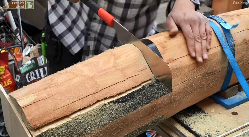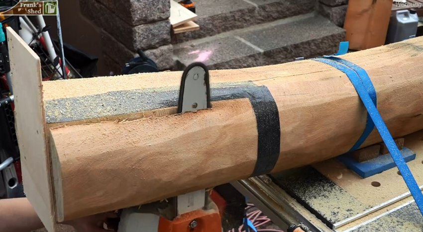 Затем снизу столба в продольном направлении, с двух сторон, на длину скобы выпиливается лишняя толщина. Чтобы не резать на перекос, следует прикрутить к кругляку шаблоны из фанеры на торец и бока. Это позволит сделать подрезку ножовкой.