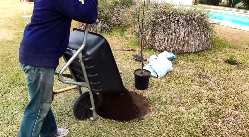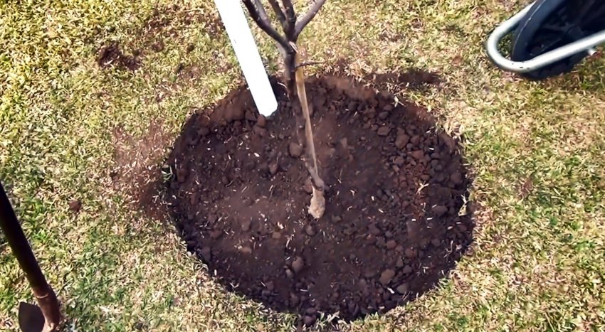 В подготовленную таким образом лунку высаживается деревце, как и обычно.