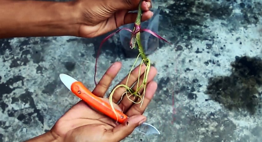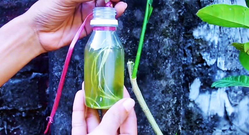 Этот лоскут окунается в горлышко пластиковой бутылки наполненной водой, и она привязывается к ветке. Примерно за месяц из щепки прорастет корешок. Чтобы он не погиб, воду следует доливать.