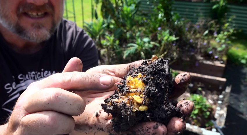 Скорость разложения растительных кухонных отходов достаточно быстрая, поэтому периодически можно закапывать новые порции на старые места, где все уже переработалось. Так, банановая кожура превратится в компост за пару недель, початок от вареной кукурузы уже спустя месяц перейдет практически в стадию трухи.