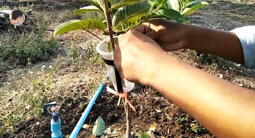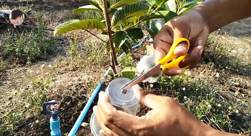 Разрез на стенке требуется продолжить до этого отверстия. Затем подготовленный стаканчик сбоку надевается на ветку, чтобы оголенная часть без коры оказался внутри.