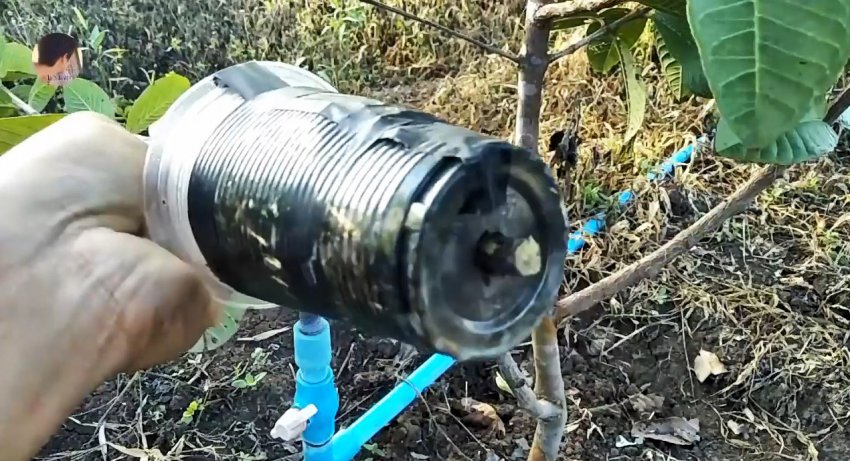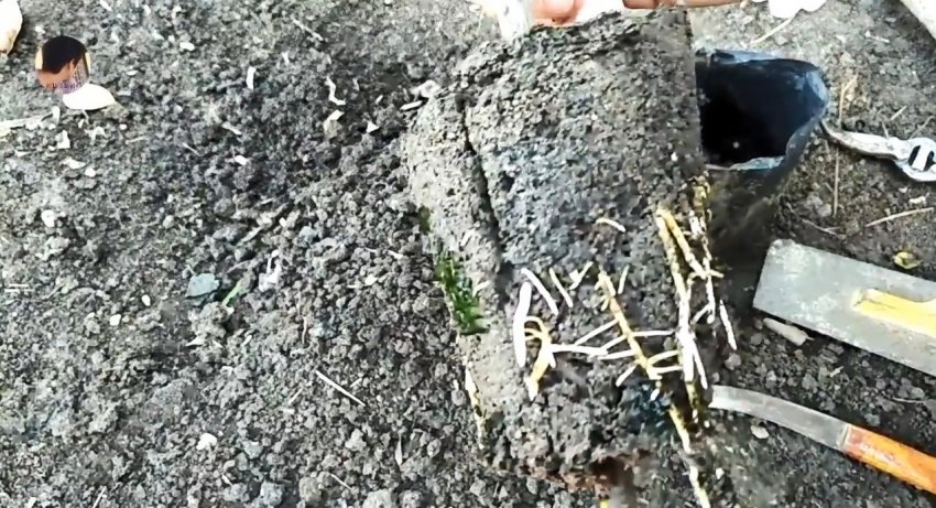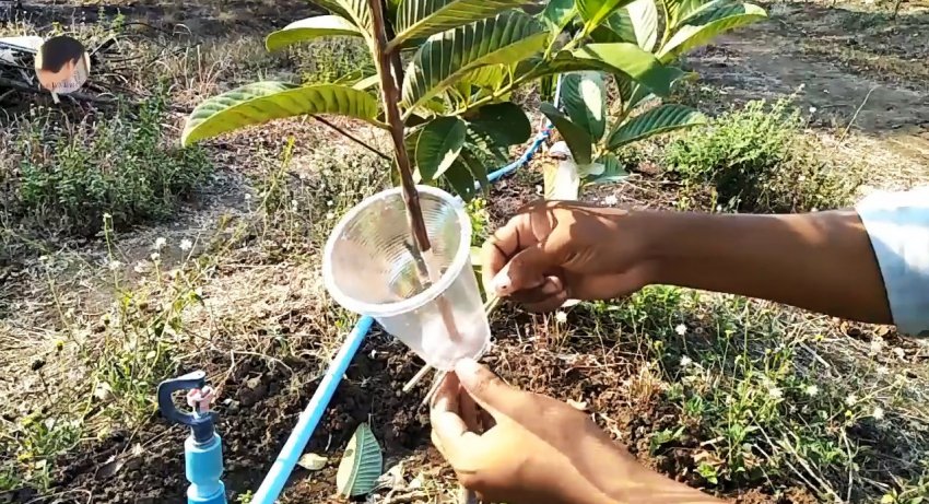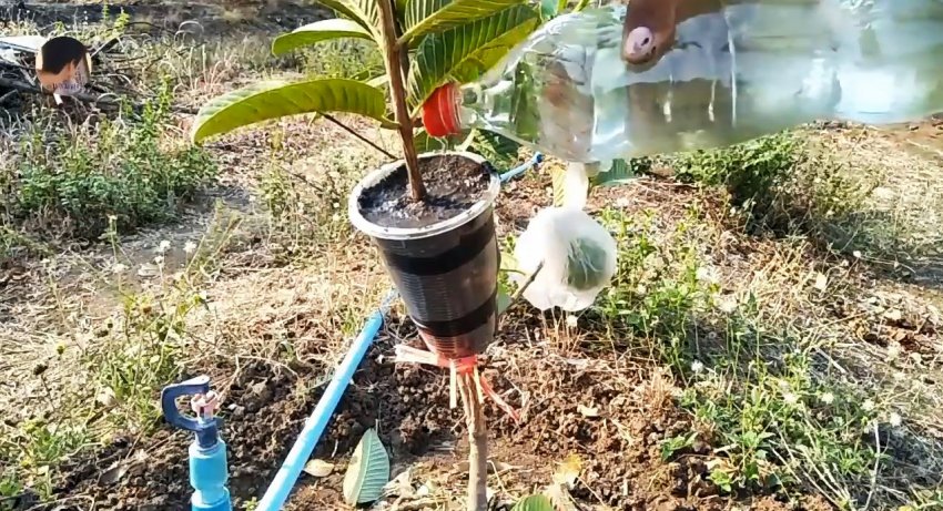 Теперь необходимо скрепить стаканчик изолентой или скотчем, и затем засыпать его обычно землей, взятой под стволом этого же дерева. Она утрамбовывается и заливается водой.