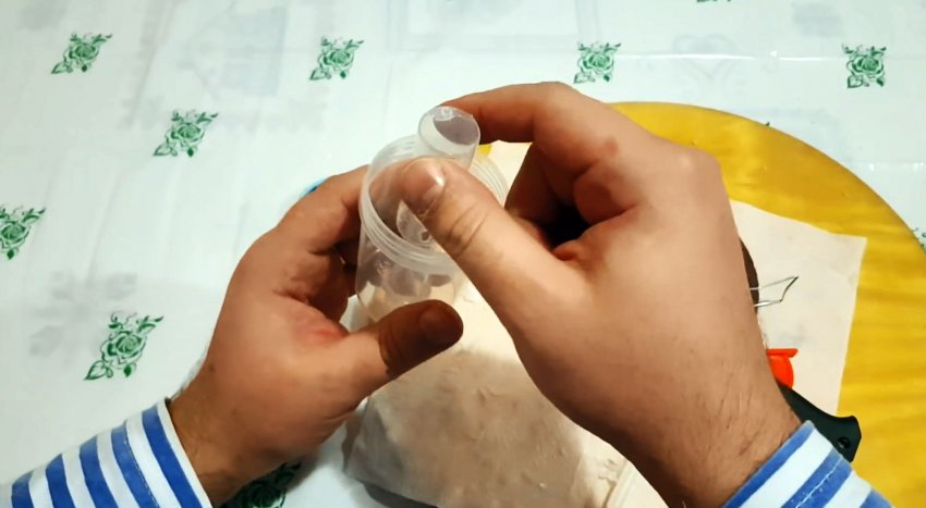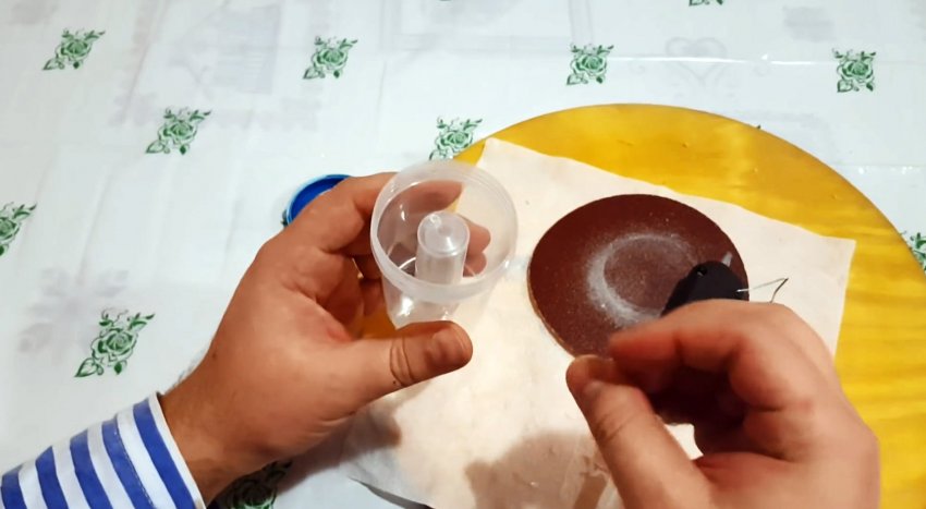 Меньший шприц вставляется в баночку широким отверстием наружу. Он должен выпирать на 2-3 см, затем стык проклеивается.