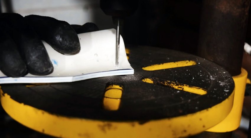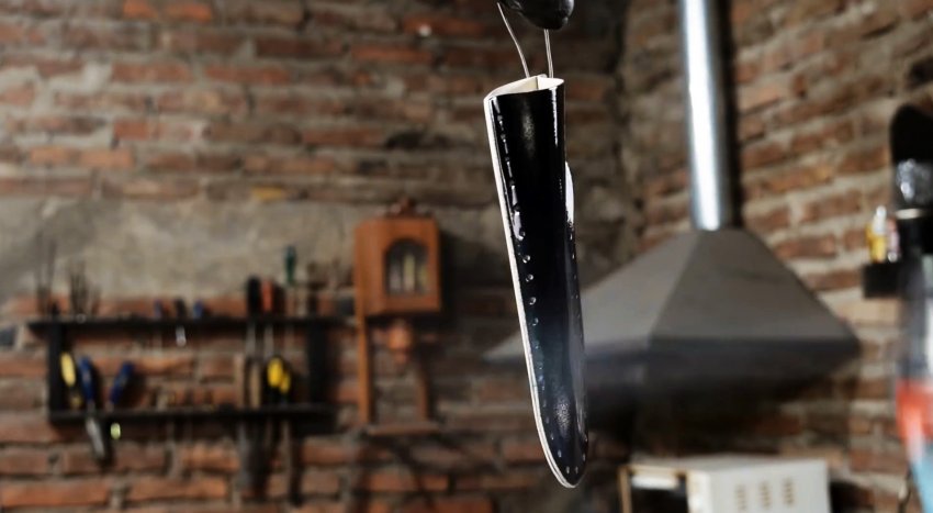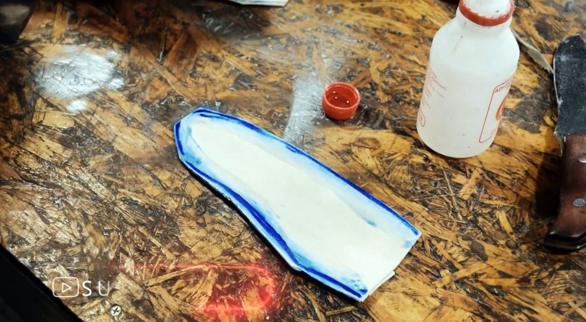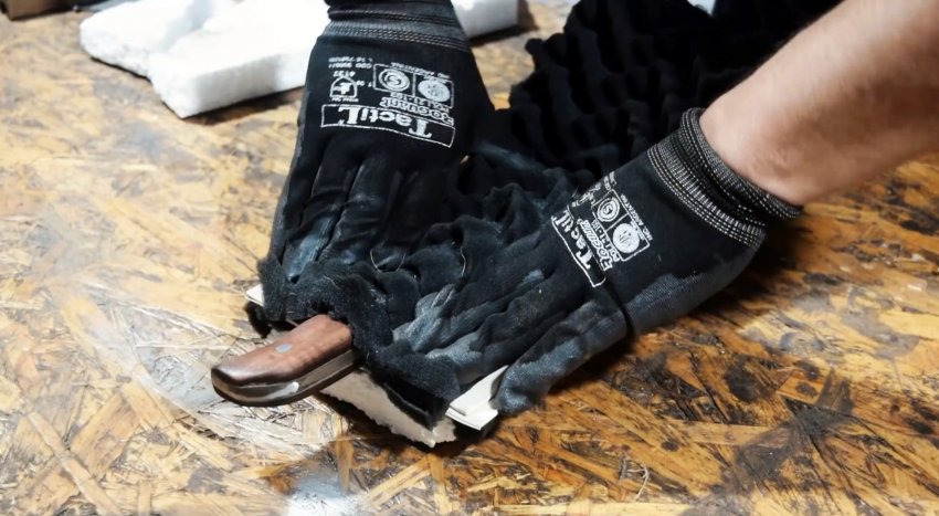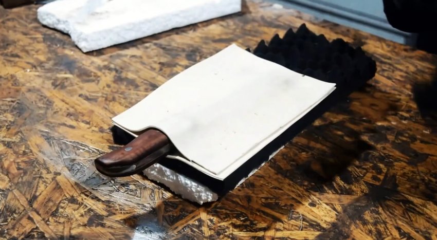 Обе пластины снова греются, затем между ними помещается клинок ножа с частью рукояти. После этого все сжимается через ветошь или губку, чтобы пластик обволок нож.