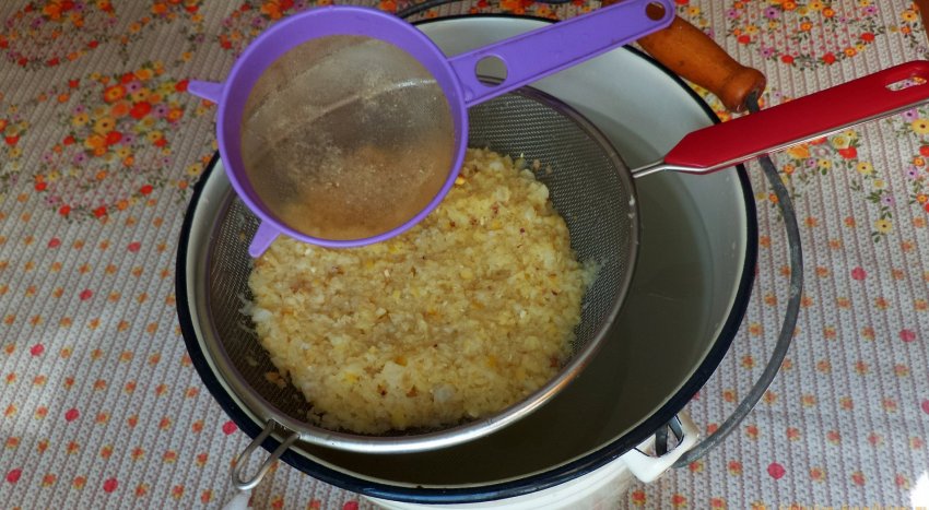 Процеживаю остывший лимонад через два вида ситечка, чтобы убрать лишние фракции и оставить почти полностью очищенную жидкость.