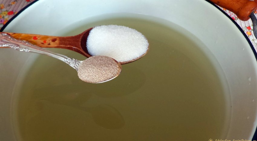 Растворяю в полученной жидкости сахар и дрожжи. Если кто-то по каким-то причинам не любит газированные напитки, то добавление дрожжей можно пропустить. В таком случае вы просто получаете освежающий лимонно-имбирный компот, немедленно готовый к употреблению. Однако я все же рекомендую добавить дрожжи, чтобы соблюсти изначальную задумку и лимонад получился «для взрослых».