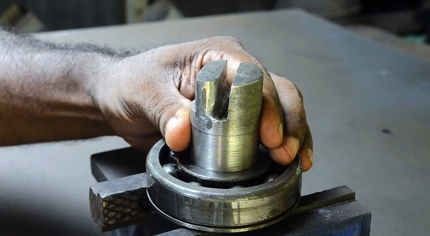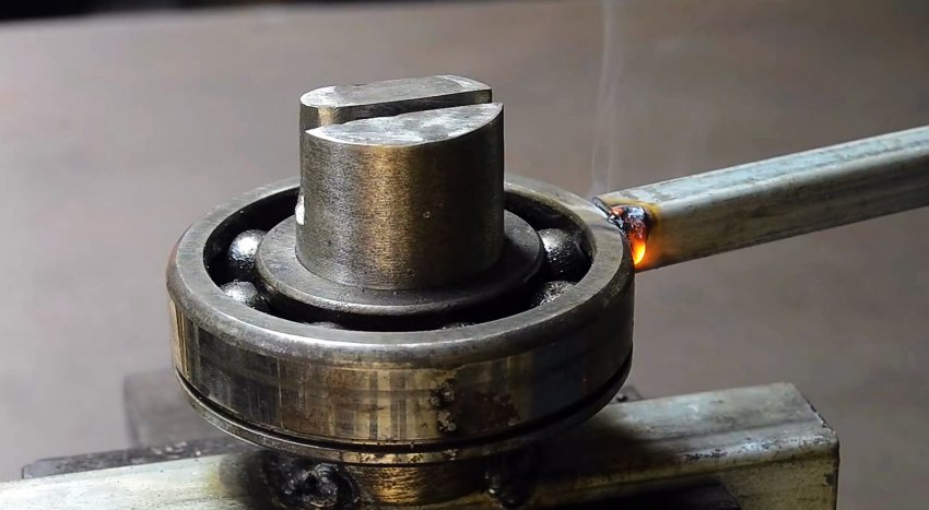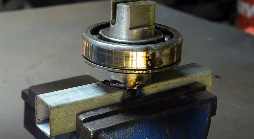 Вал запрессовывается в подшипник. Затем его нужно приварить на отрезок профильной трубы. Она нужна просто, чтобы удерживать станок в тисках.