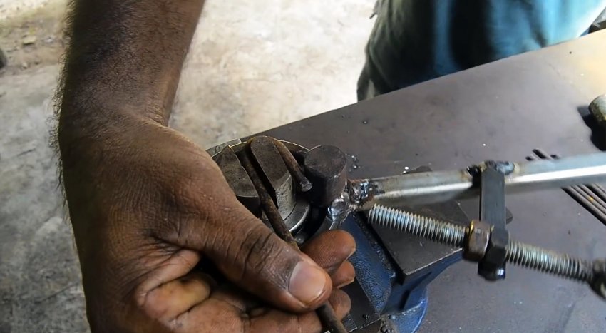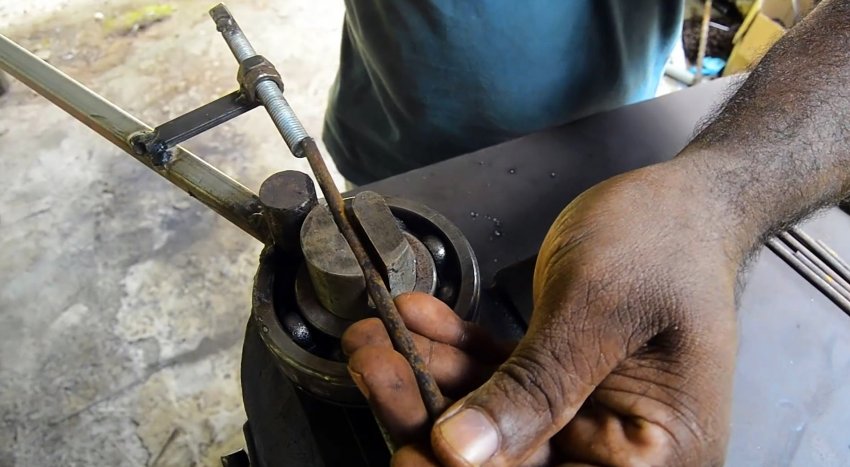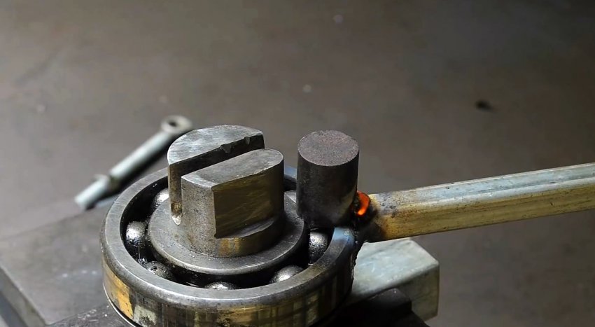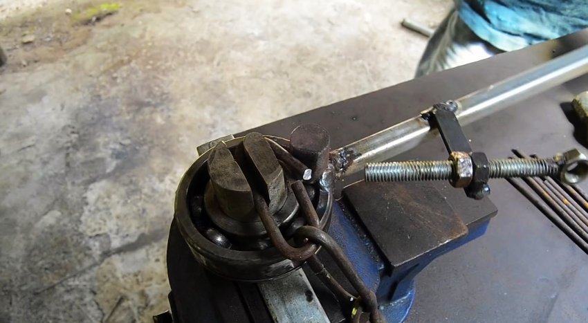 К подшипнику приваривается длинный рычаг, за который будет выполняться изгиб прутков в звенья. Напротив паза к обойме подшипника наваривается палец из кругляка длиной равной шипам. Между ними делается небольшой зазор, чтобы вставлять прутки.