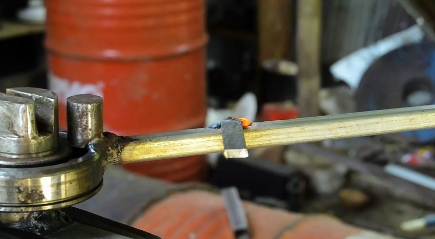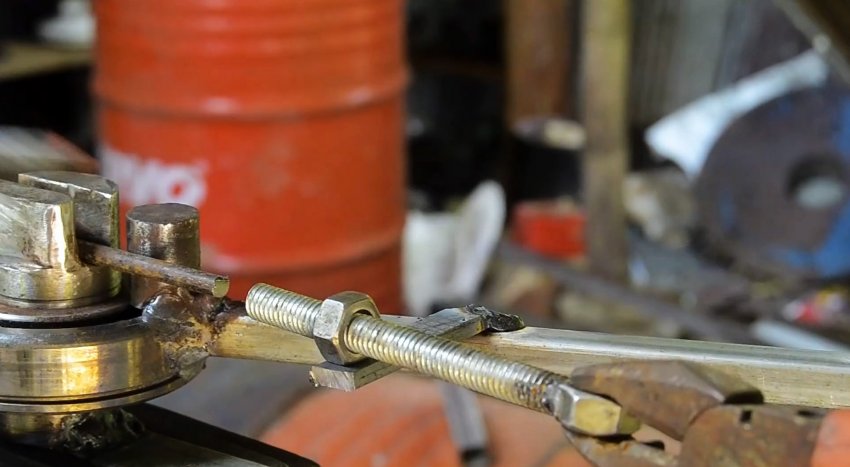 На рычаг наискось приваривается отрезок полосы. На его край нужно приварить гайку и закрутить в нее шпильку или длинный болт. Он послужит ограничителем для прутка, чтобы правильно его позиционировать при изгибе звена. Фиксировать положение болта можно дополнительной гайкой.