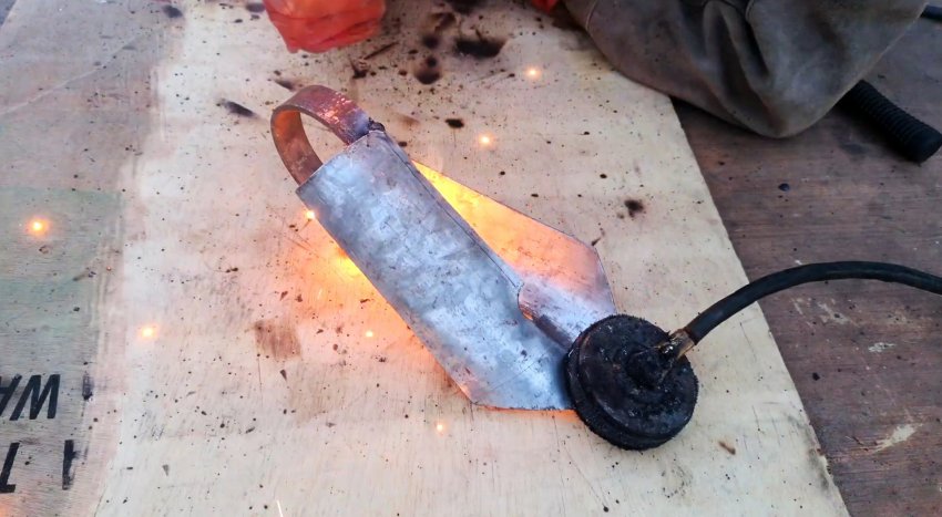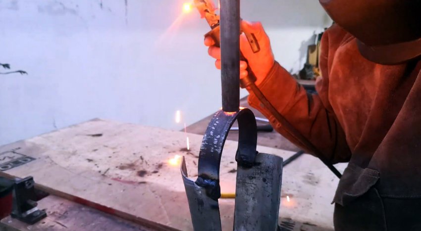 Далее к ножу приваривается полукольцо из согнутой полосы, чтобы придать жесткость.
