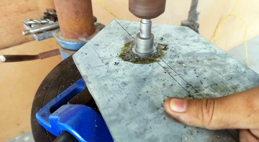 Чертеж вырезается болгаркой. В нем просверливается отверстие коронкой 20 мм.