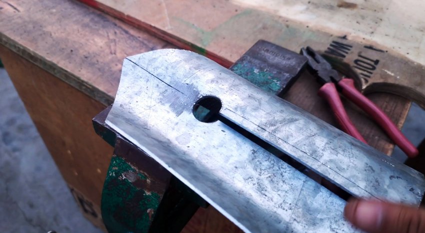 Затем заготовка распускается по центральной линии от ровного края до отверстия.
