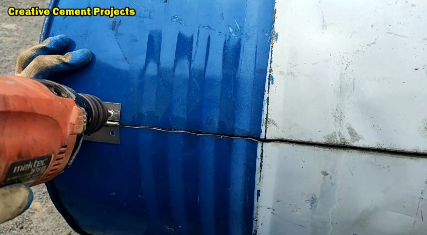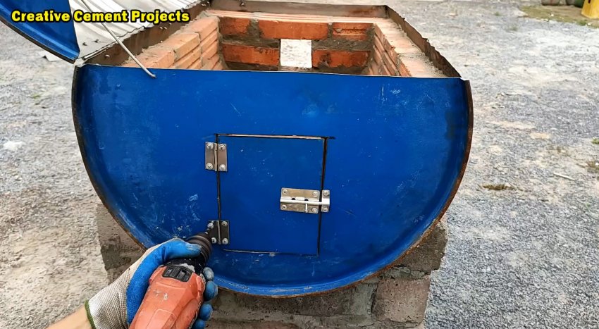 К печи прикручивается вторая половина бочки на дверные петли. На полученную крышку спереди устанавливается ручка. Сбоку делается подпорка из проволоки, подобно поддерживающей капот автомобиля.