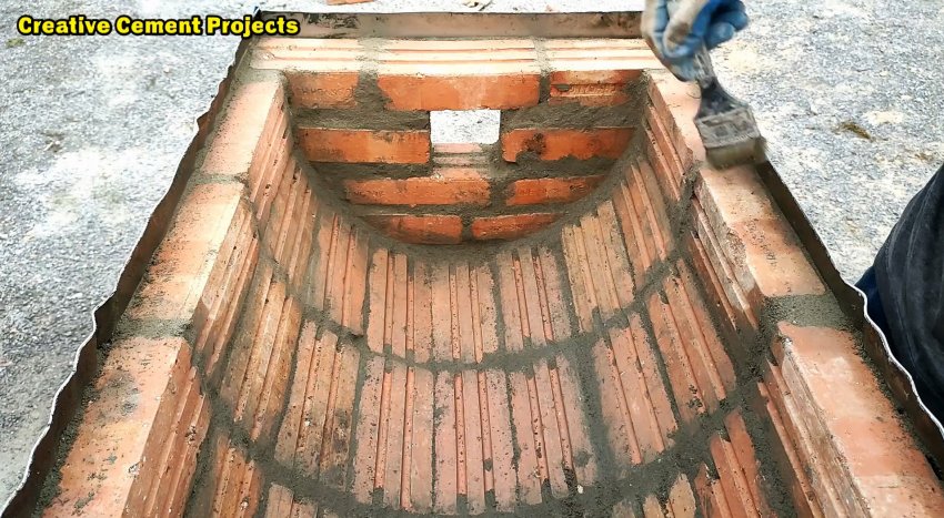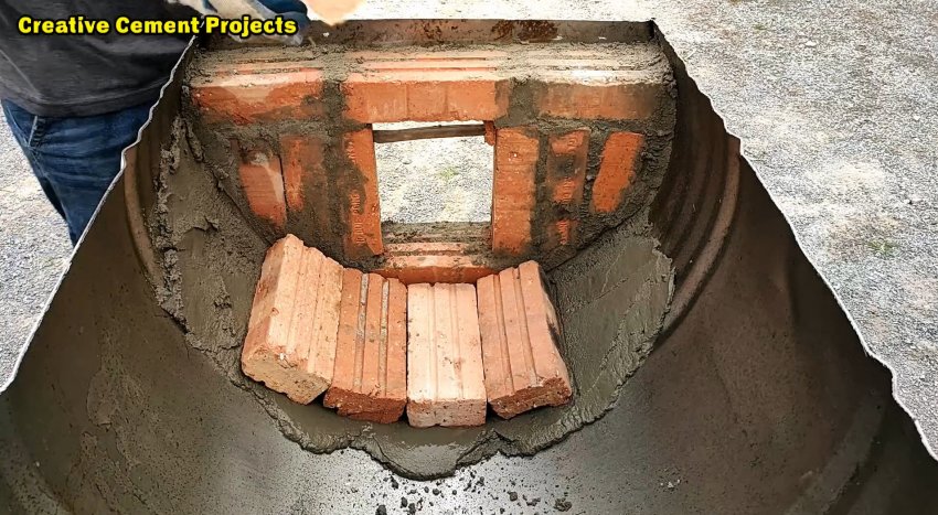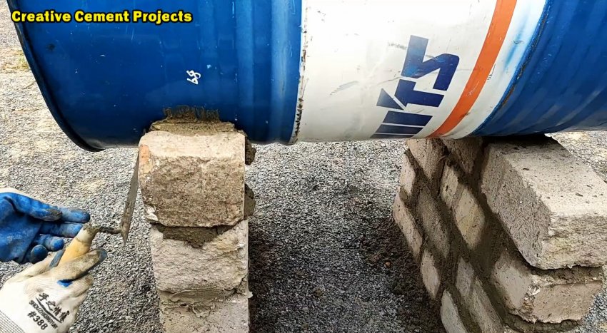 На ножки укладывается большая половина бочки. Затем с боков она закрепляется раствором и половинками кирпича.