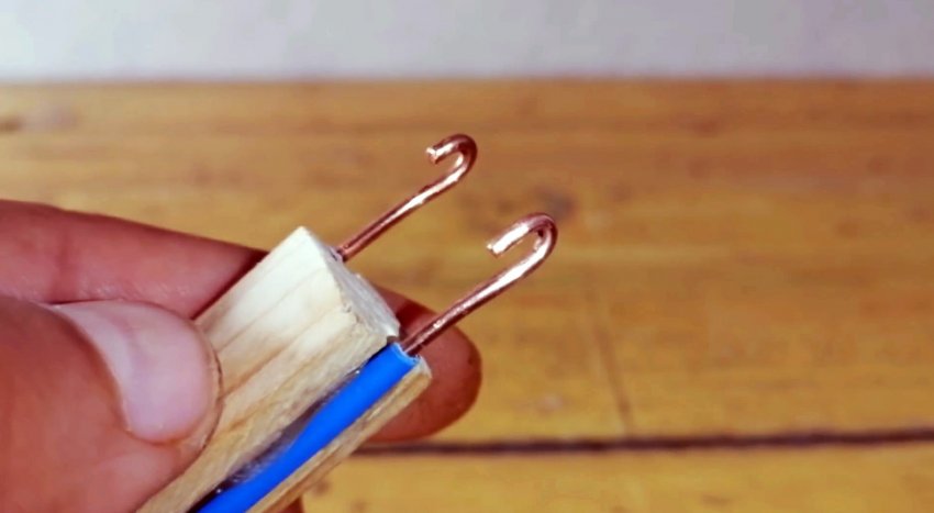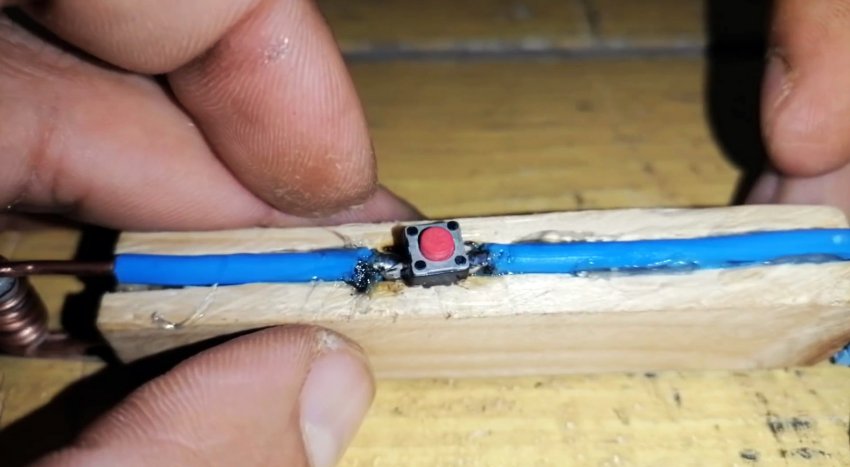 В один из боковых проводов следует впаять прижимную кнопку, чтобы разрывать и замыкать цепь.