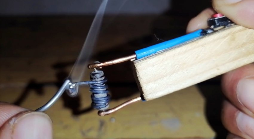 Для пайки различных мелочей нужен соответствующий по размеру жала паяльник, который к тому же не будет перегревать схемы и миниатюрные электронные компоненты. Его можно сделать своими руками из резистора 10 Ом. Особенность этого паяльника в том, что он греется только в момент прижатия кнопки.