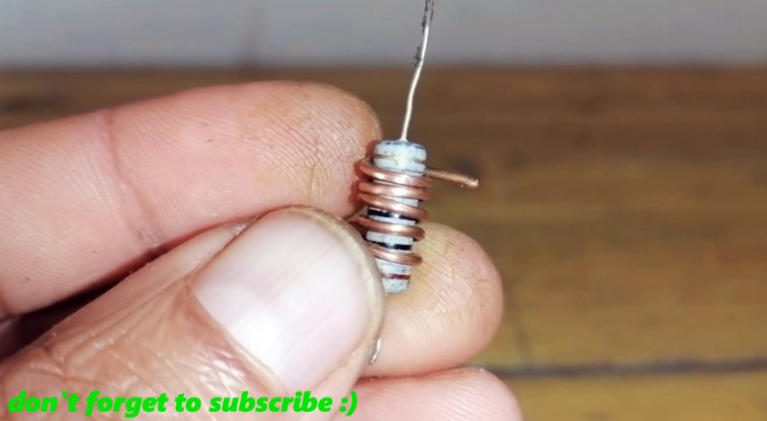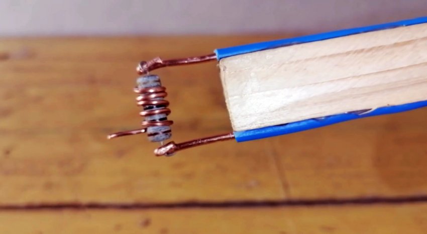 Затем нужно взять резистор, и намотать на него эту проволоку. Требуется хотя бы 5 витков. Один край намотки откусывается, а второй следует оставить. Это будет жало паяльника.