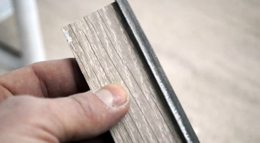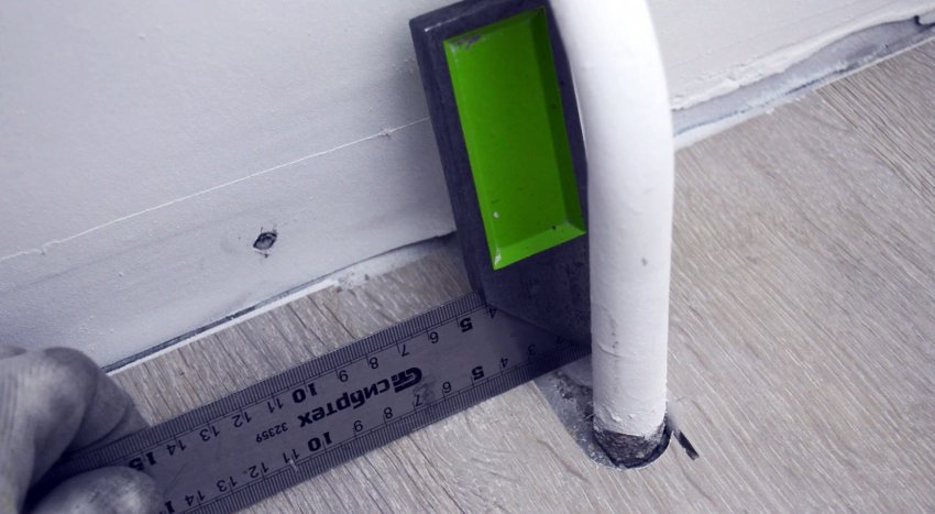 Затем от него до края плашки нужно вырезать полосу. После этого ламинат с вырезом укладывается на свое место.