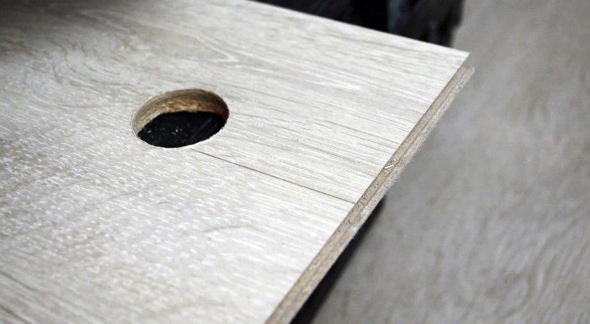 Для этого в ненужном обрезке ламината просверливается отверстие этой же коронкой, чтобы сформировать такую же округлость. Затем от него расчерчивается требуемая вставка. При распиле важно, чтобы по отмеченной линии шел край пильного диска, а не центр. Полученная заготовка если нужно дорабатывается напильником и вставляется в вырез.