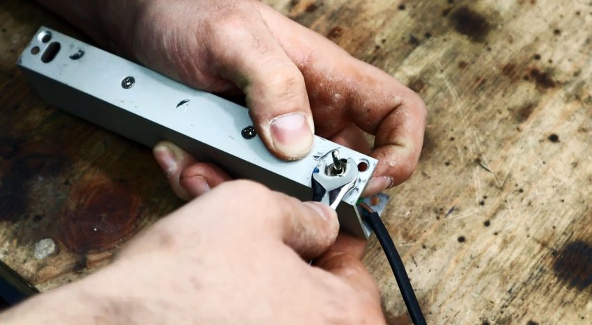 Из нее требуется удалить плату управления. Важно запомнить последовательность проводов на ней. Они зачищаются и скручиваются попарно: первый и третий, второй и четвертый. Также встречаются замки всего с двумя проводами, с ними все еще проще.