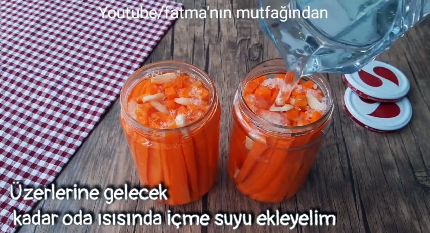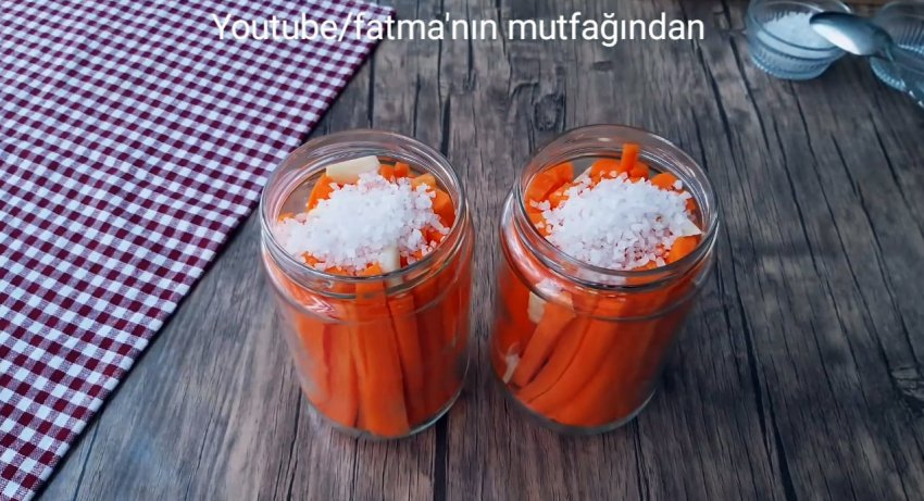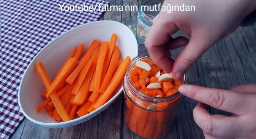 На дно банок забрасывается немного чеснока, затем сверху вертикально накладывается соломка. Нужно заполнить ее плотно, затем наложить чеснок сверху. Из полкило моркови получится 2 банки закуски.