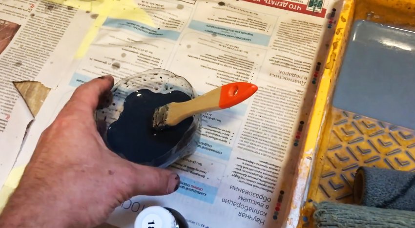 Когда стены высохнут после грунтовки, их нужно сделать влагостойкими, нанеся оптически прозрачную эпоксидную смолу. Это делается маленьким велюровым валиком. Она наносится тонким слоем, чтобы не было подтеков. Ее расход на 15 кв.м стен получился 800 мл, так что покупать ее нужно примерно с таким расчетом.