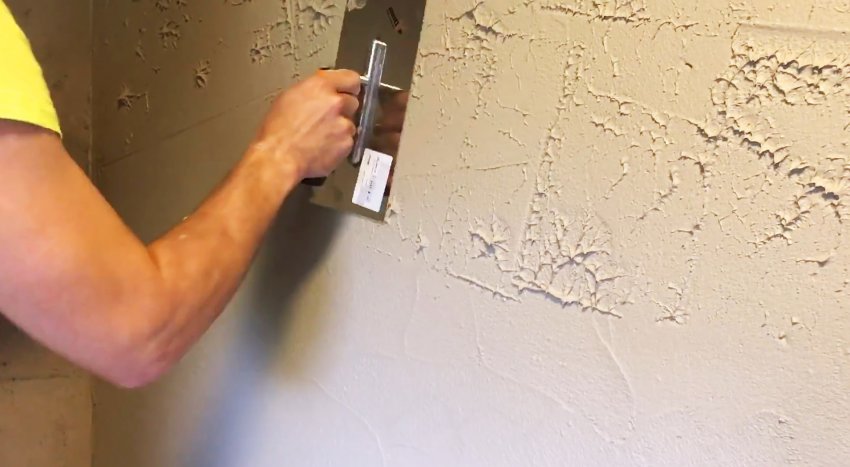 Когда штукатурка перестанет липнуть, ее рисунок нужно пригладить мокрым шпателем. Стараться довести все до идеала за один раз не стоит. Нужно быстро пройтись по всей стене, а потом сделать это мокрым шпателем повторно сколько потребуется. Стоит задача просто убрать выступы штукатурки, но сохранить впадины.