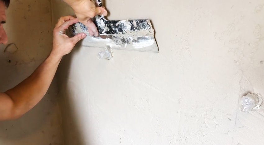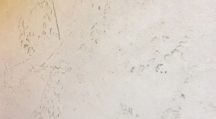 Пока штукатурка свежая, нужно создать на ней фактуру прикладывая и оттягивая металлическую гладилку или кельму. Рисунок должен быть хаотичным, поэтому направление кельмы можно менять, как и силу прижима.