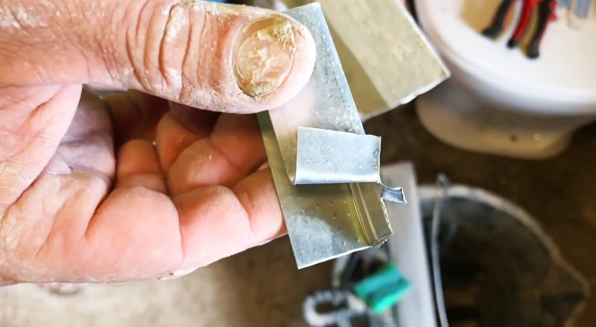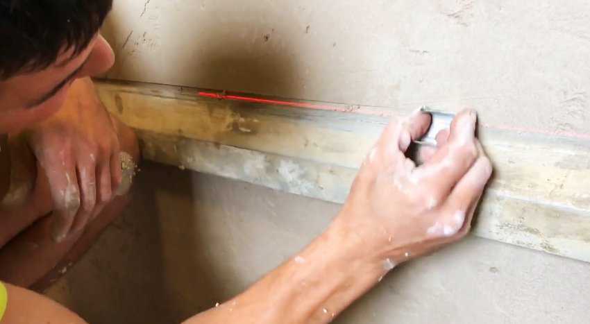 Дальше нужно вырезать имитацию швов. Для этого по уровню прикладывается правило и штукатурка срезается. Это делается самодельным скребком. Его можно вырезать из обрезка профиля.