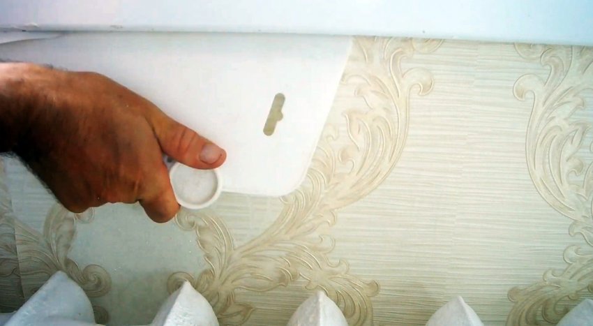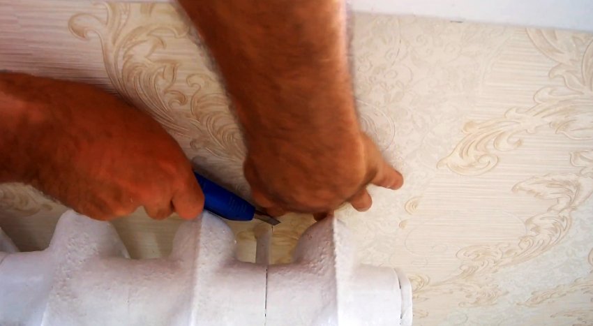 По насечкам делаются ровные надрезы монтажным ножом под линейку до начала кронштейнов. После этого место поклейки промазывается обойным клеем, за батареей это можно сдать только изогнутой кистью.