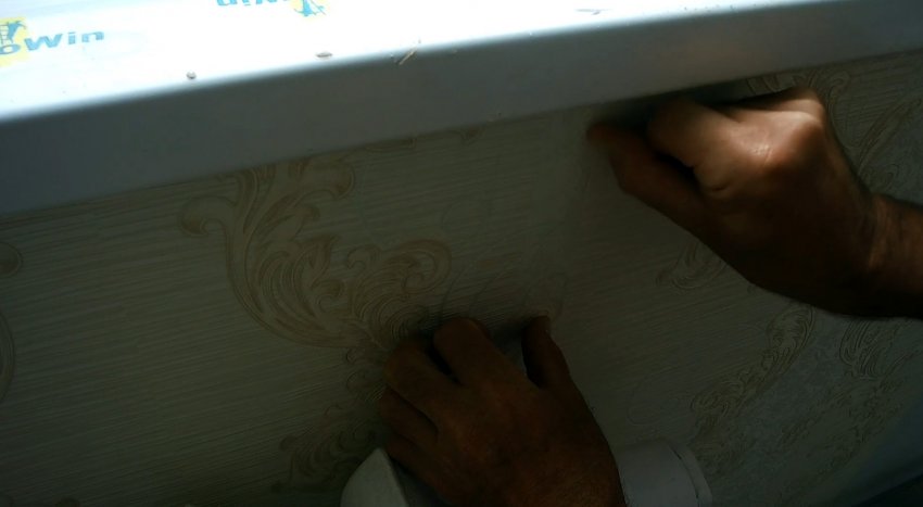 Дальше вырезается кусок обоев с запасом по высоте для поклейки в оставшийся пропуск. Его нужно приложить сверху, делая нахлест на уже поклеенные по бокам внизу обои, чтобы совместить рисунок. Дальше на нем оставляются насечки напротив кронштейнов.