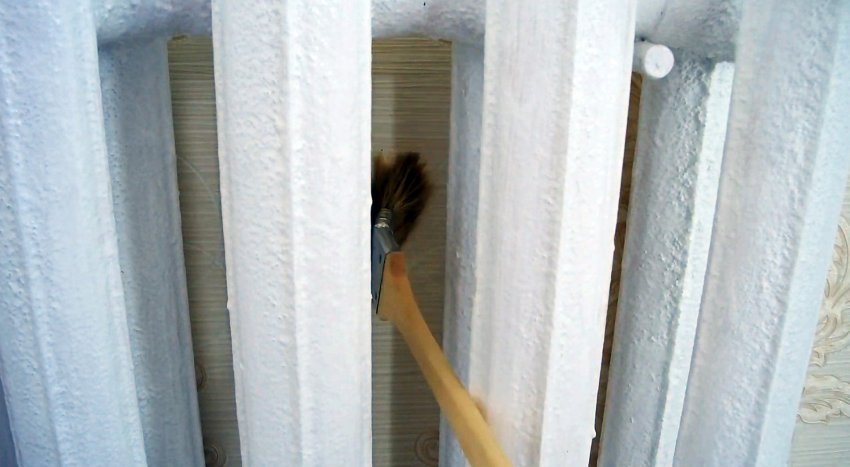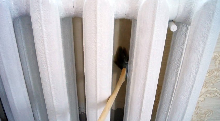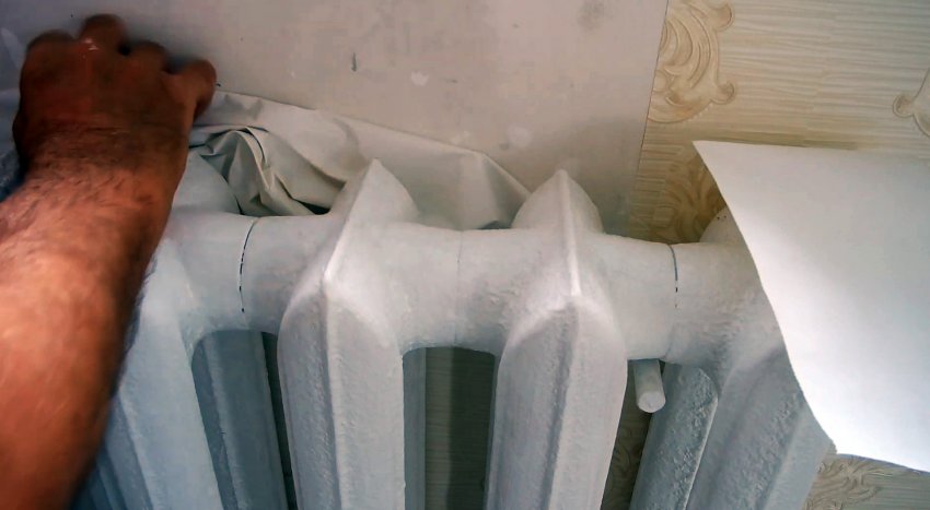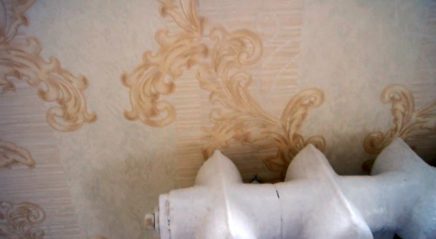 Обои вставляются за батарею сбоку под креплениями, затем расправляются и выводятся вверх. После упора в кронштейны нужно развернуть подвороты и пригладить их над радиатором до подоконника. Вся плоскость обоев прижимается. Между ребрами радиатора это делается кистью.