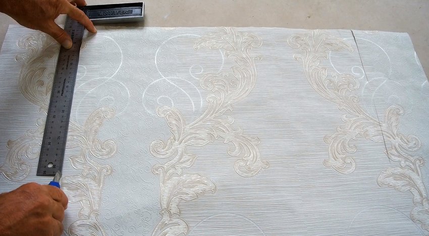 Последним шагом является вертикальная подрезка перехлестов. Это делается по кромке лезвия шпателя. Рез выполняется напротив ребер крайних секций батареи. Это позволит визуально скрыть сбой в рисунке обоев, если он получился. Затем вырезанные полоски срываться, на стену наносится клей еще раз, и края приглаживаются.