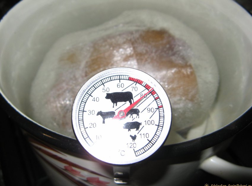 Тепловую обработку ведем в емкости с водой, температура воды должна быть в пределах 79-82 градуса. Процесс тепловой обработки ведем до момента, когда в центре рулета температура не будет составлять 70 градусов, после чего процесс приготовления завершаем. По времени весь процесс приготовления занимает чуть больше двух часов, однако все зависит от веса мясного сырья и объема воды.