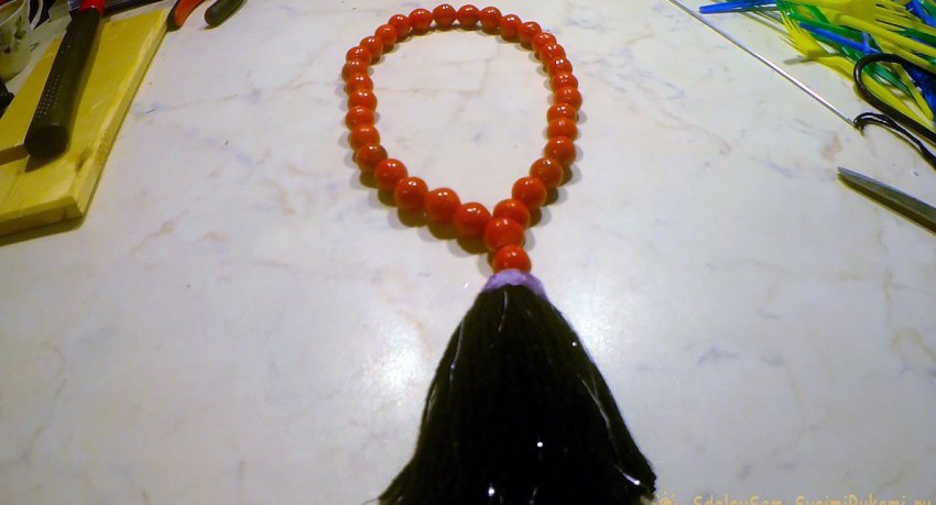 Кисточку делаю из ниток для вязания. Наматываем нужное количество, я беру книгу, не считал сколько витков, кому какая пышная нужна. На ребре книги завязываем тоненькой ниткой, тем самым фиксируем кисточку. Затягиваем её в чётки как описано выше, под натяжение ножниц обрезаем другой край намотки. Расчесываем одной ножной от ножниц и обрезаем в ровень, повторяем несколько раз.