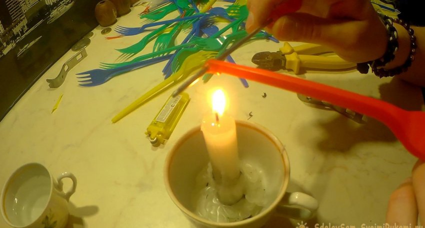 Затем я использовал тоненькую плоскую отвёртку для накручивания на неё пластика, отрезав от неё наконечник. Возможно использовать шило или спицу, мне же попалась отвёртка да и ручка у нее имеется, будет комфортно нагревать и не обжечься.