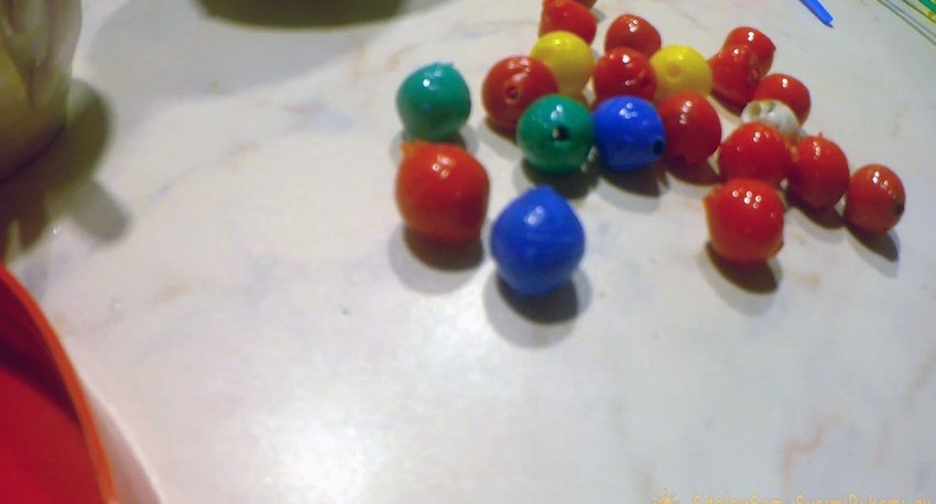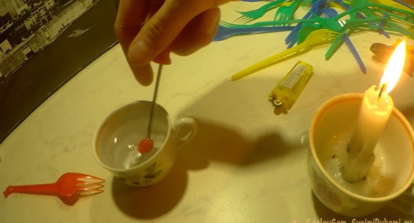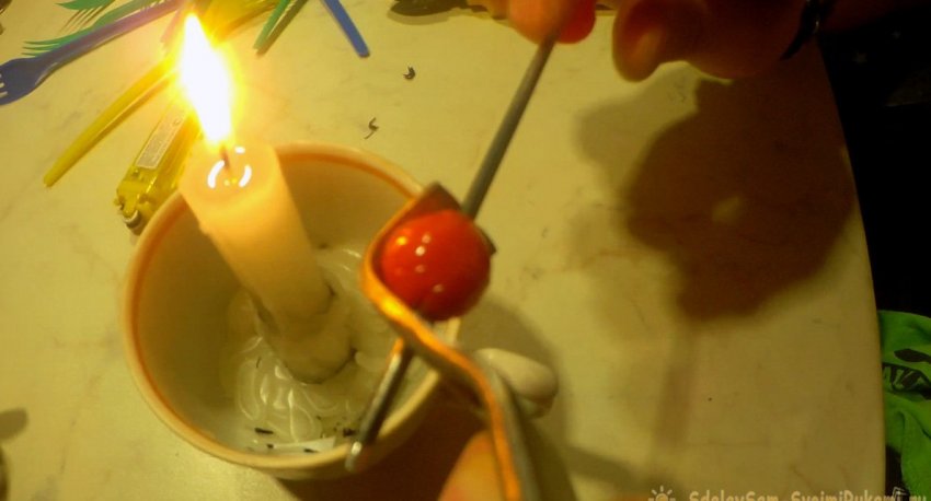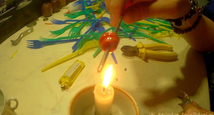 Теперь зажигаем свечу и подносим над свечой отвёртку с пластиковой вилкой. Она начнет от нагрева сама закручиваться на отвёртку, если нет, поможем ей пальцами. Закручиваем до конца вилки, не даём гореть, только плавить, и засовываем её в матрицу, начинаем крутить, чтобы сформировать шарик. Греем несколько раз и прокручиваем все эти разы до нужной и красивой формы. В конце подогреваем ещё для глянца и окунаем в воду на 3 секунды, не передерживаем, потом не сниматься с отвёртки. Так делаем 33 бусины.
