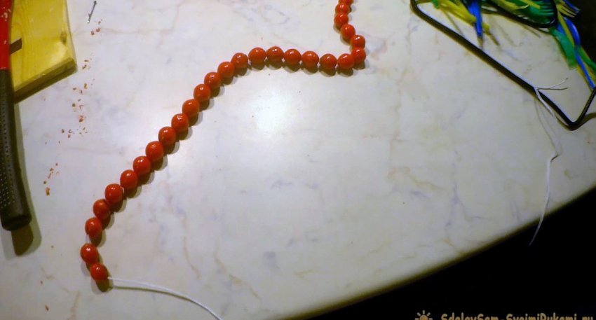 Собираем чётки на верёвку или нитку, я купил шнурок в магазине рукоделия, жена у меня из них делает браслеты. Собираем все шортики на нитку и один шарика две нитки сразу. Далее нужно сделать полушар для кисточки. Я взял пластиковые шарики, опять же с магазина поделок, распилил пополам и углубил нишу в середине. Её просовывает тоже в два шнурка и продаем вокруг кисточки и опять в полушар обратно, там завязываем на узел.