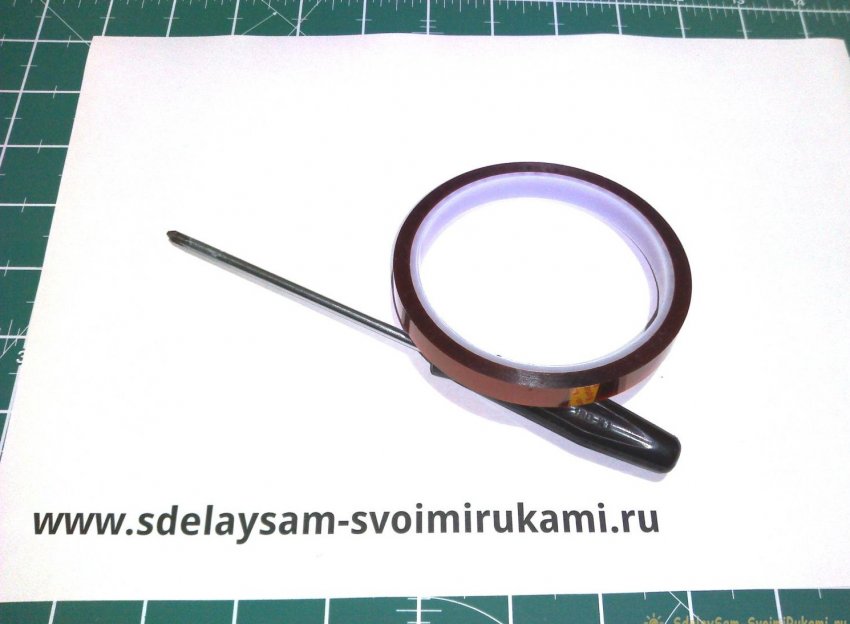 Затем снимаем старый нагреватель. Обычно он завернут в каптоновый скотч – специальную цветную (чаще оранжевую или зеленую) пленку, способную выдерживать температуру до 400 °C. Этот скотч также можно купить с остальными радиодеталями в виде вот такого мотка: