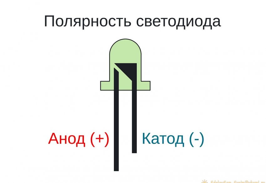 Вторые концы проводов нужно припаять к разъему питания – здесь полярность не имеет значения, поэтому соединять можно как угодно. По желанию, для индикации включения термопистолета, можно добавить светодиод с токоограничительным резистором, как в приведенной выше схеме. Лучше, если он будет неярким, чтобы его свет не бил в глаза и не отвлекал при работе. Помните, что у светодиодов есть анод (плюс) и катод (минус):