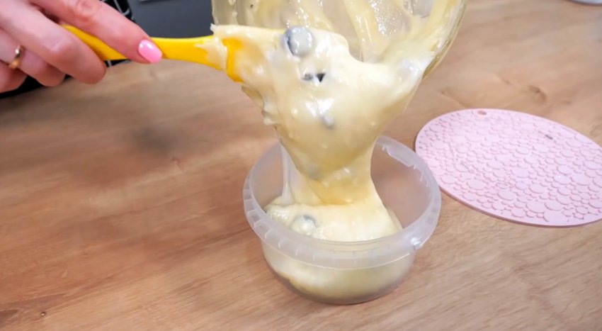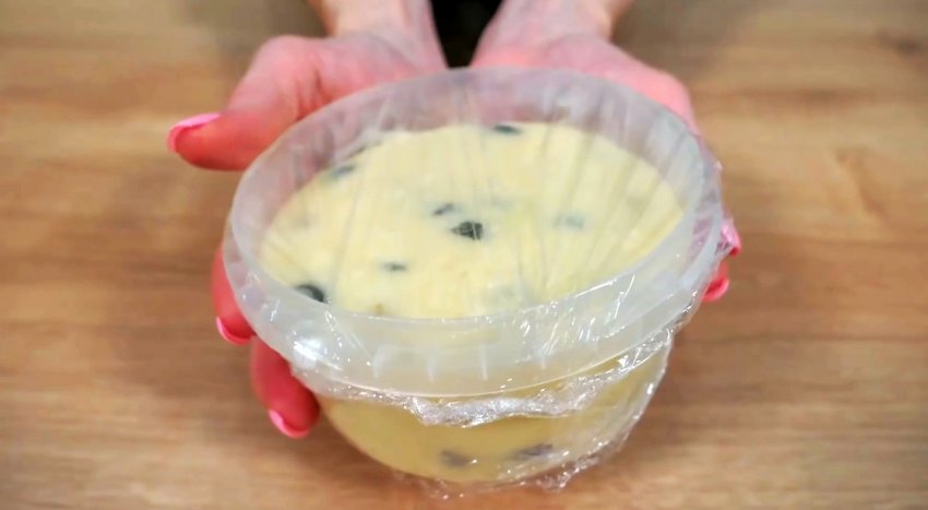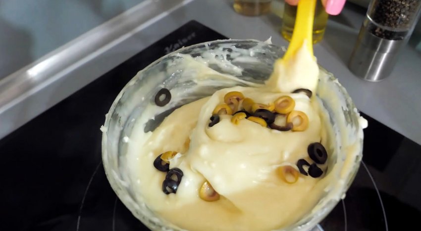 В первую часть расплавленного творога добавляются нарезанные кольцами оливки. Для контраста можно использовать зеленые и черные. Масса пересыпается в пластиковый контейнер и утрамбовывается силиконовой лопаткой. Затем контейнер накрывается пленкой, и после остывания до комнатной температуры переносится в холодильник.
