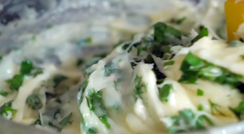 Вторую часть творога нужно расплавить также, и добавить 20 гр. рубленой зелени. Подойдет петрушка и укроп, или что-то другое на свой вкус. Затем масса переливается в контейнер.