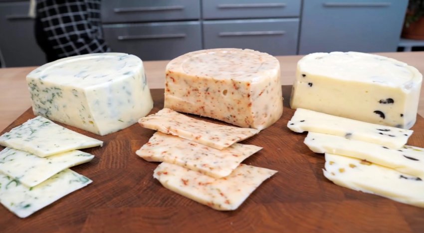 В результате из 2 кг творога можно сварить 3 головки по 0,5 кг отличного твердого сыра с разными вкусами. Из них получается красивое сырное ассорти, которым не стыдно угостить гостей.